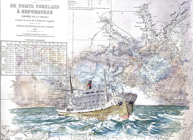Aquarelle originale sur une authentique carte marine de 1830.