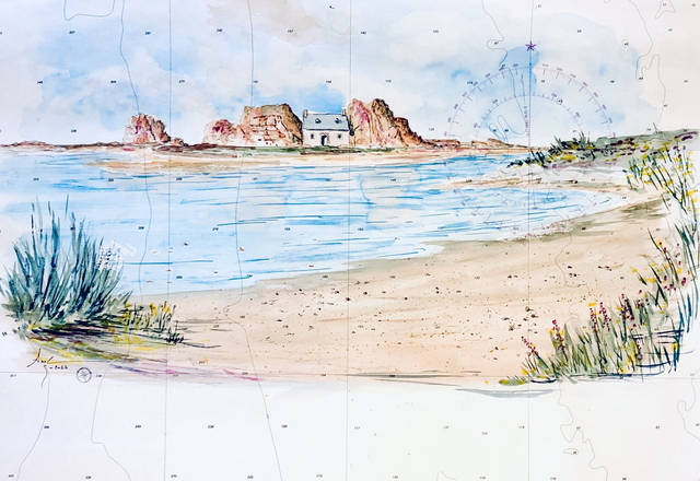 Aquarelle originale réalisée sur une carte marine de 1985.